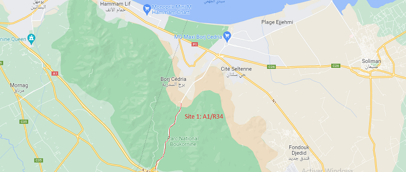 On our way to Korbous, we will visit the site of the exit ramp from the highway to the Cap-bon region. This part of the road is a groove in the Boukornine mountain and was the subject of a civil engineering project to to stabilize the cliffs on either side of the road A1/R34.